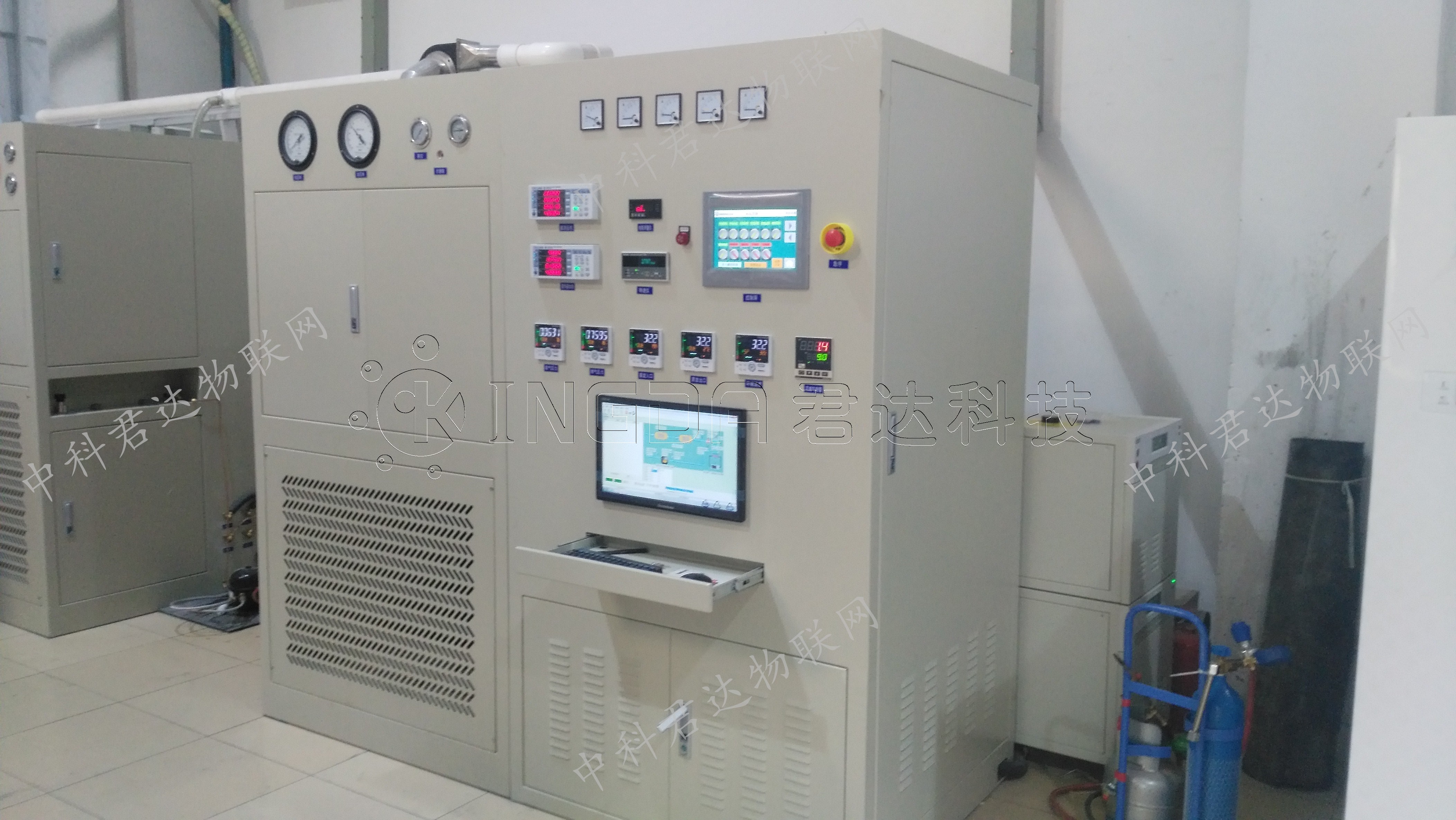 Other Requirement | 1. The system is designed with two sets of circuits, switched by electric shut-off valve (selected in the touch screen), and one set is used for normal working condition testing (such as noise and vibration test). At this time, the whole system with condenser and evaporator is running (such as noise and vibration). Test), the other set is used for compressor startup performance test, only connects the simple circuit with capacity tank, does not contain the condenser and evaporator circuit, and adjusts the suction and discharge pressure difference through the high-precision manual throttle valve; see the system diagram for details 2. Two sets of output pipelines are installed in the system cabinet, one set of pipelines is connected to the silencing room, and one set of piping is connected to the silencing room, and the two sets of electric shut-off valves are interlocked and switched (selected on the touch screen); 3. The electrical circuit should have enough capacity, the starting current capacity is 30A, and the voltage drop cannot exceed 2% when starting the test; 4. To start the test loop, ensure that the internal volume of the high-pressure pipeline is not less than 50cm3 (add a capacity tank if necessary); 5. The liquid storage tank in the main circuit has a refrigerant window, and a buoy is placed in the window to determine the refrigerant level; 6. The evacuation, filling, recycling and environmental control functions in the system can be started and stopped manually on the touch screen; 7. Only increase the sampling point of the compressor inlet temperature in the pipeline inside the muffler chamber (only display but not control); 8. Two shell temperature sampling points are set in the silencing room and outside (only displayed on the recorder or touch screen); 9. All solenoid valves, electric shut-off valves and electric expansion valves of the main circuit can be opened and closed manually (mainly used for cleaning); 10. Install a refrigerant recovery device, and the refrigerant is recovered into the system, using an oil-free compressor (common to R600a and R134a). |